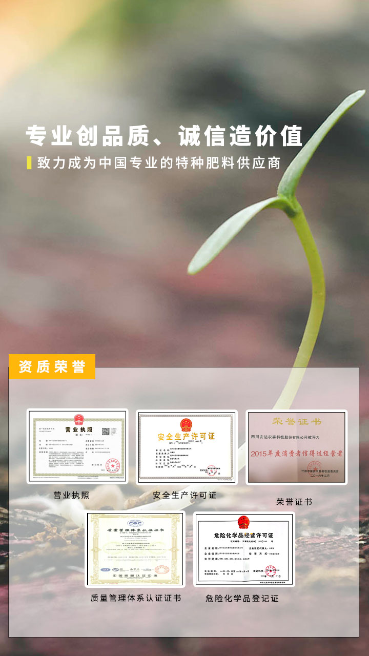 經(jīng)過二十余年的探索和實踐,依托自身技術(shù)和出口背景,按照國際市場規(guī)范培養(yǎng)了大批高素質(zhì)的專業(yè)化技術(shù)化團隊,掌握了水溶性肥料的核心技術(shù),擁有完善的研發(fā)中心、質(zhì)檢中心,目前已獲得多個國家專利技術(shù)。公司一直把“做中國專業(yè)的特種肥料供應(yīng)商”作為自身的發(fā)展使命。推廣高端植物營養(yǎng)與先進技術(shù),高效施肥方式的綜合配套方案,減輕中國種植業(yè)勞動強度,讓種植業(yè)效率更高、效果更強、效益更好!努力成為革新中國種植業(yè)生產(chǎn)方式的偉大公司!